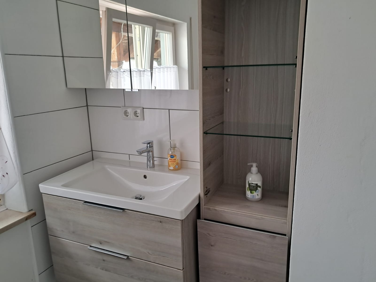 1x modernes Badezimmer mit Waschmaschine